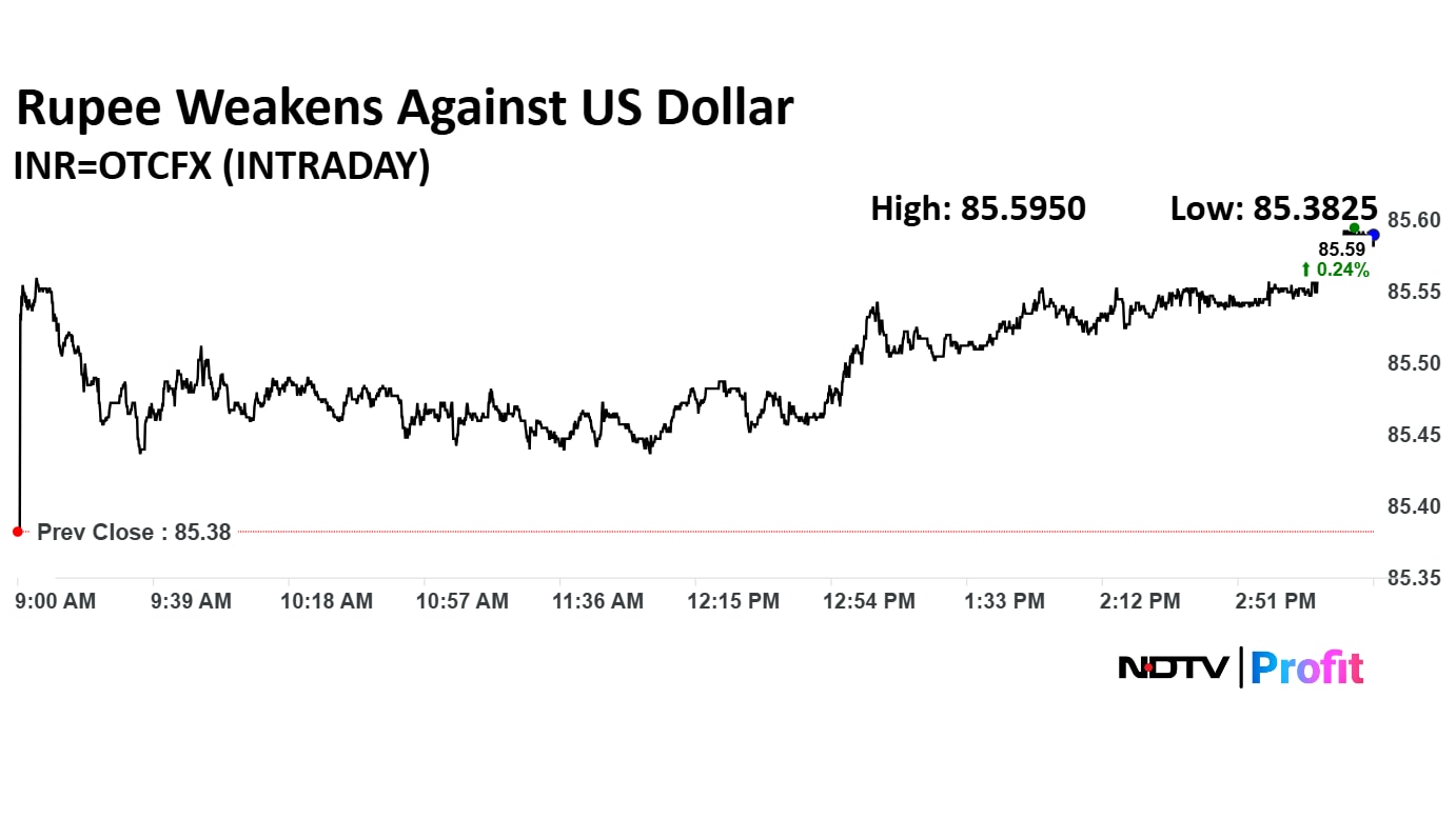 • Rupee closed 20 paise weaker at 85.59 against US Dollar