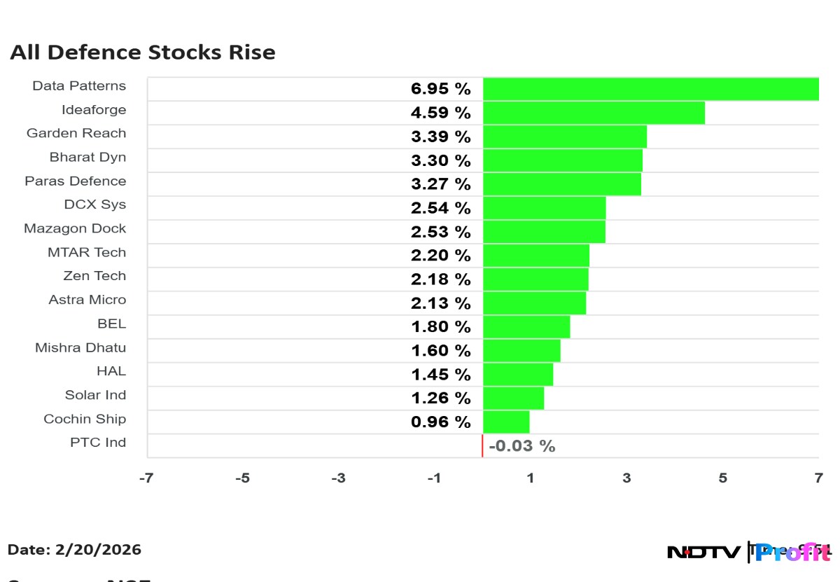 All defence stocks rose during early trade on Friday. Data Patterns jumped 7%, Ideaforge gained 5% and PSU majors GRSE and Bharat Dynamics popped 3%.