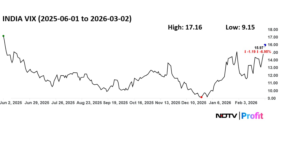 The India Volatility Index, known as the fear gauge, soared to a nine-month high today. The India VIX jumped nearly 20% to 16.38, a level last seen during June's 12-day Israel-Iran war.