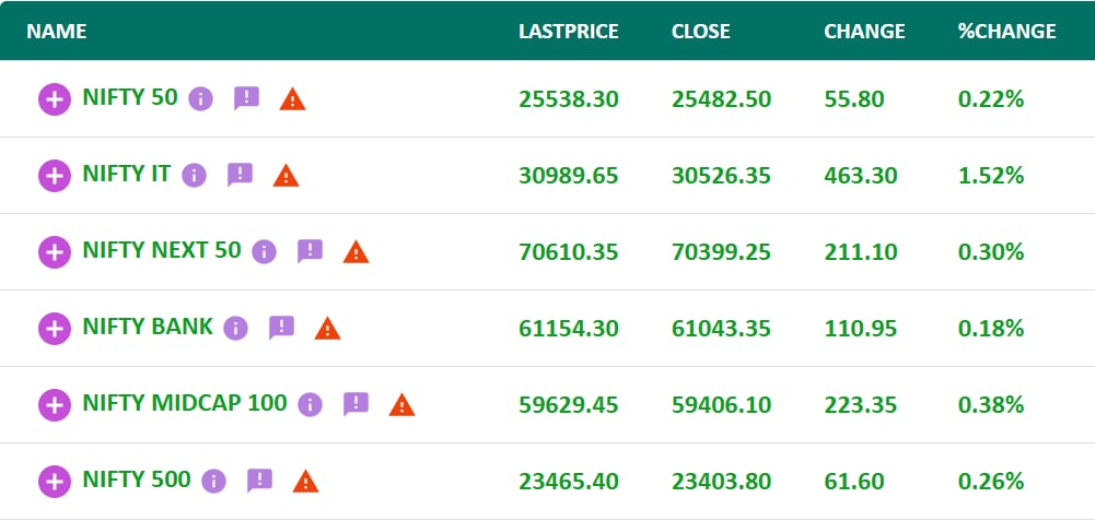 India's benchmark Nifty and Sensex opened higher on Thursday, taking positive cues from Asian and US equities. The Nifty 50 opened 73 points or 0.3% higher at 25,556 and the BSE Sensex jumped 142 points to 82,418.