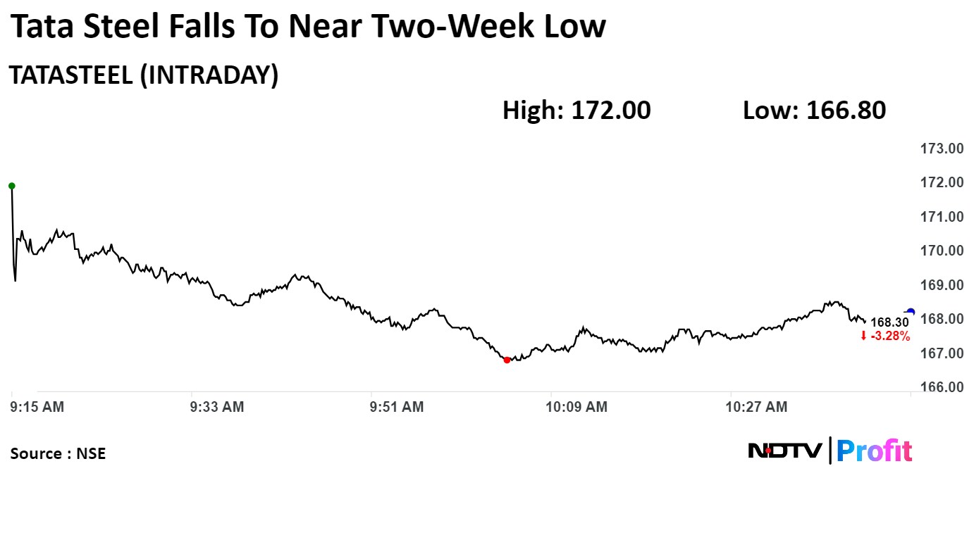 Shares of Tata Steel Ltd. declined to their lowest level in nearly two weeks on Thursday after its profit fell in the fourth quarter of fiscal 2024. The consolidated net profit of the company declined 64.6% year-on-year to Rs 555 crore during the January–March period, according to an exchange filing.
