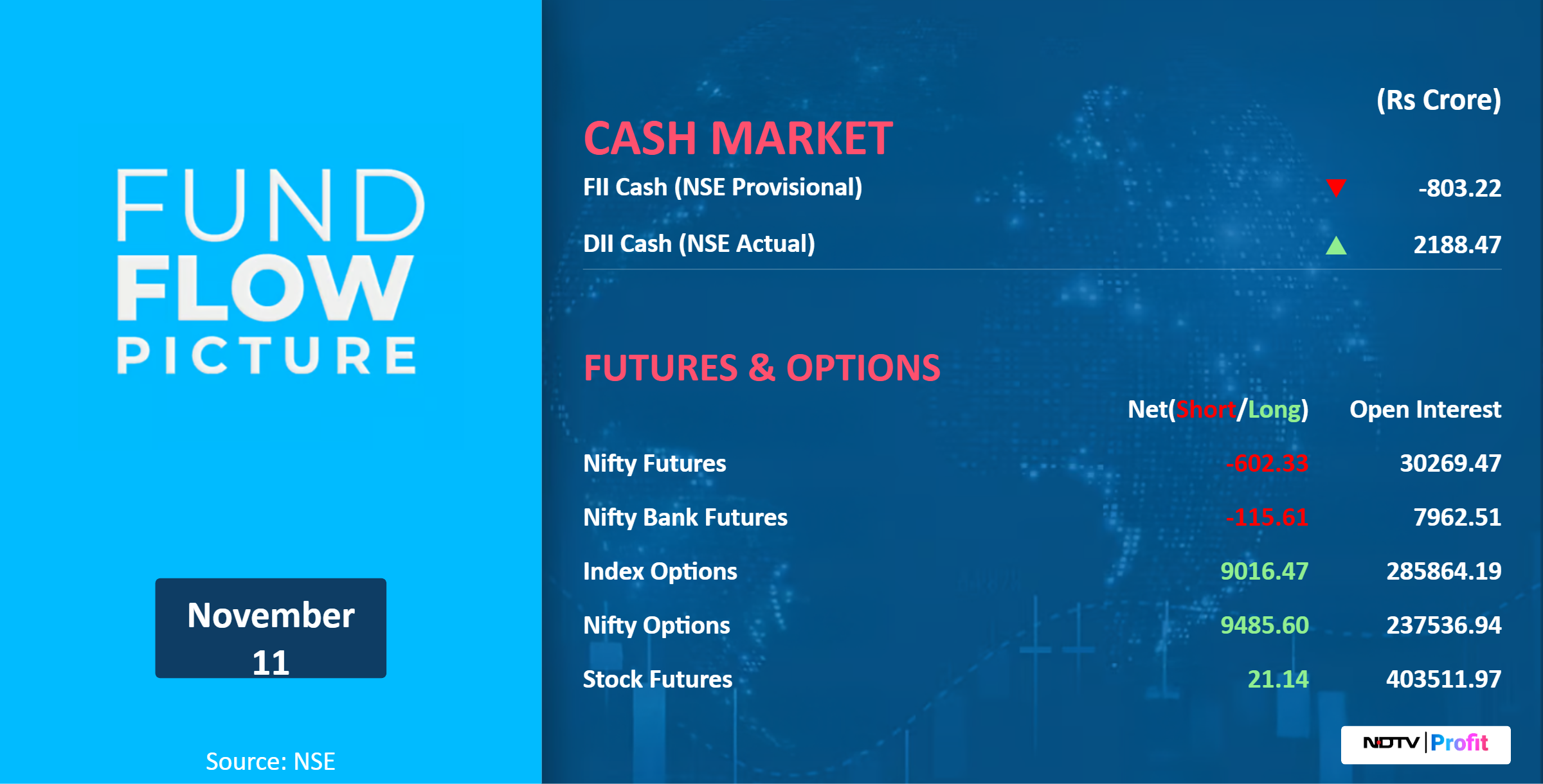 • Nifty Options 11th Nov Expiry: Maximum Call open interest at 25700 and Maximum Put open interest at 25650.