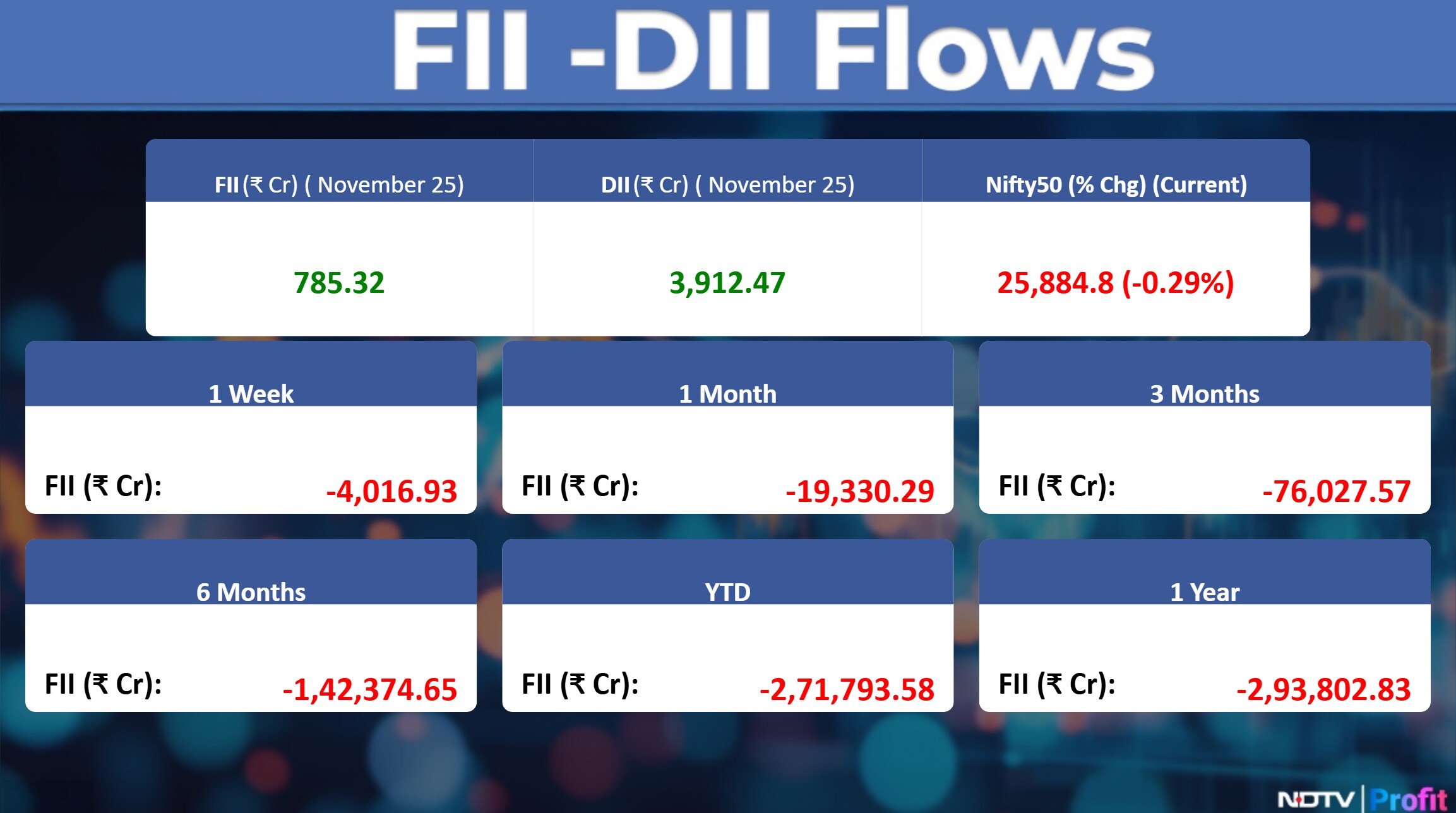 The NSE Nifty 50 closed 74.7 points or 0.29% lower at 25,884.8, while the BSE Sensex ended 313.7 points or 0.37% down at 84,587.01 on Tuesday.