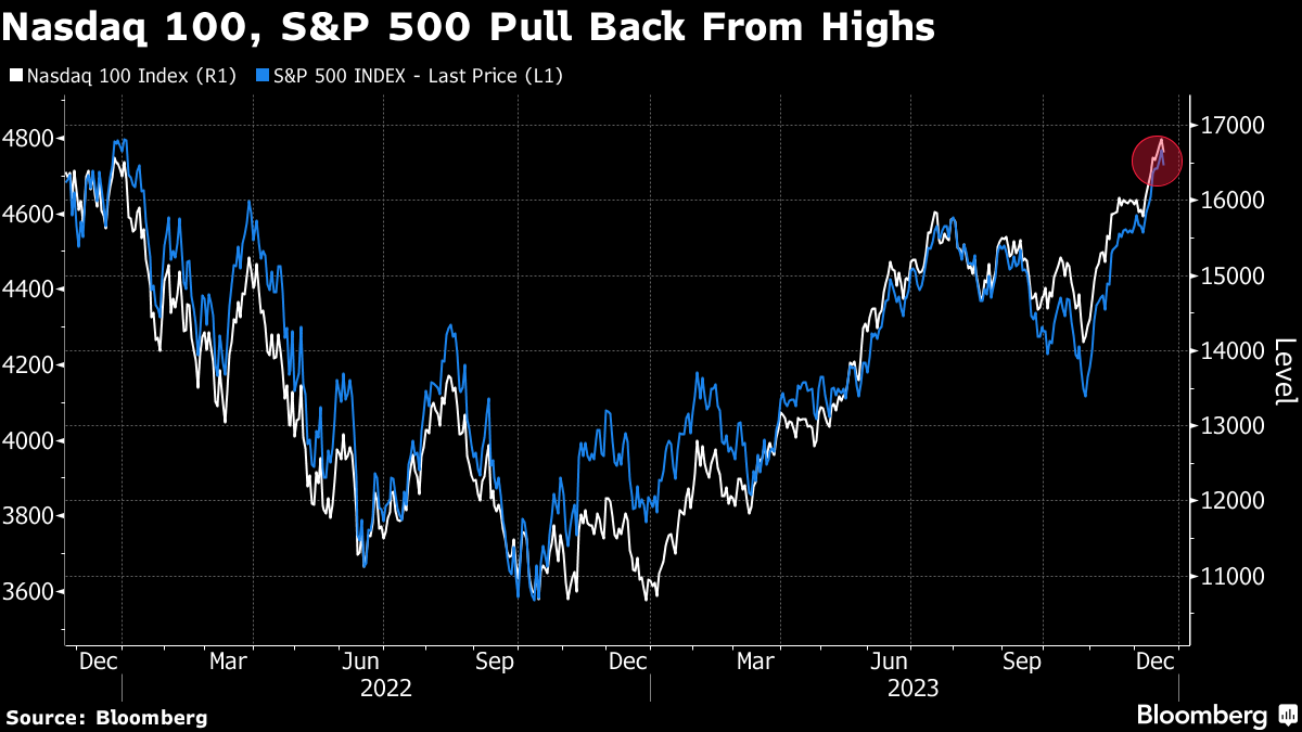 The Nasdaq 100 ended the session down , the biggest one-day drop in eight weeks, as the tech-heavy benchmark drew back from its latest all-time high. The S&P 500 fell at a similar pace in its steepest drop since Sept. 26.