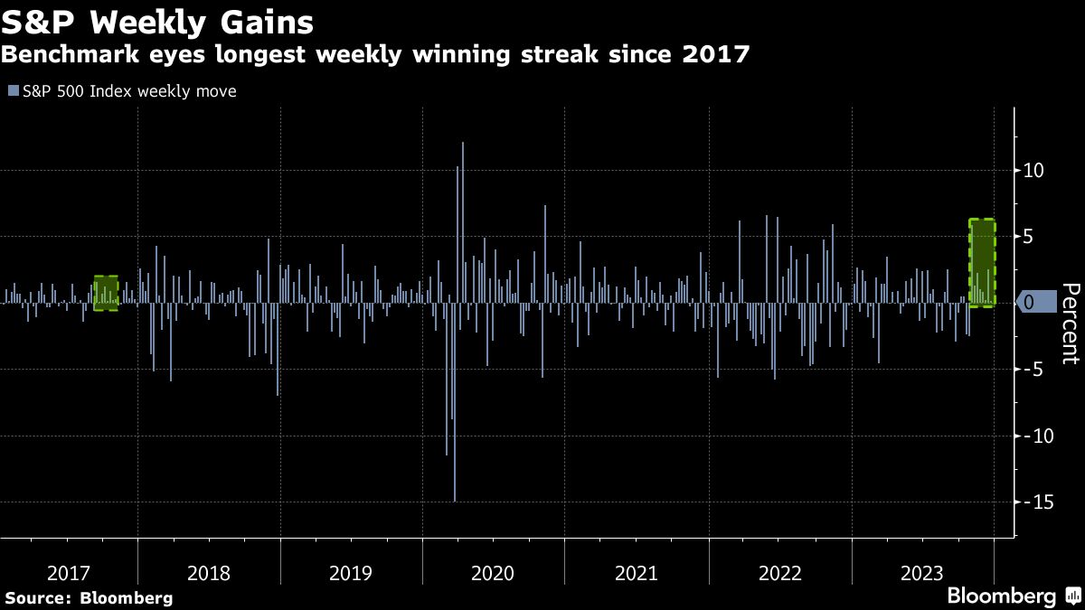 After a choppy low-volume session ahead of the Christmas holiday, the S&P 500 notched an eight-week winning streak — the longest in more than five years on signs price pressures in the US were easing. The Nasdaq 100 and a global gauge of equities logged equally lengthy runs — for the tech-heavy Nasdaq it was the longest since July 2021. US bonds booked a fourth-straight week of gains — their best streak since March.