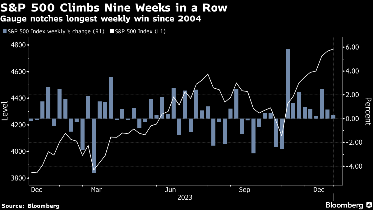 (Bloomberg) -- Wall Street's final session of 2023 saw stocks taking a breather near all-time highs. For bulls defying every doomsday scenario, that was just a blip for a market notching its longest weekly advance since 2004.