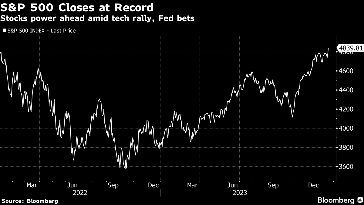 After hitting a low in October 2022, the S&P 500 has surged about 35% and topped its previous closing high of 4,796.56 on Friday. The gauge became the last of the three major US equity benchmarks to close at a record.