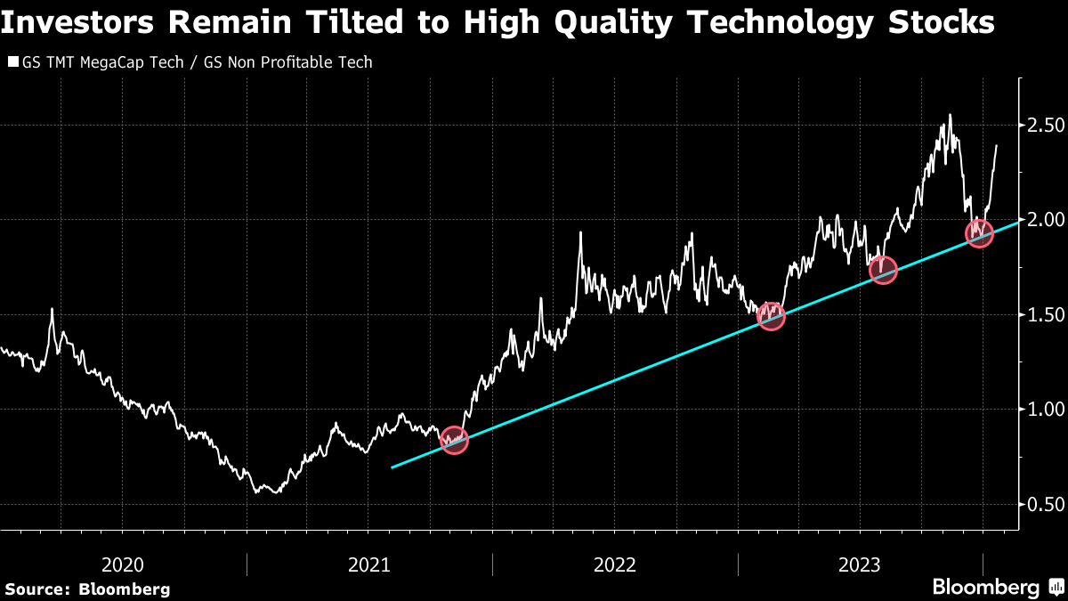 Hedge funds hold the highest level of net-long Nasdaq 100 futures in nearly seven years, according to Societe Generale's weighted analysis of data on the Nasdaq 100 Index futures and e-mini contracts provided by the Commodities Futures Trading Commission. Meanwhile, a global fund manager survey from Bank of America this month showed the most crowded trade is being long the so-called Magnificent Seven stocks and other tech-related growth shares as a way to play the prospect of Fed easing.