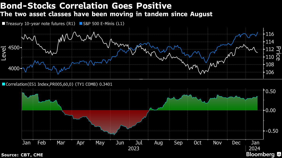 With inflation concerns lingering, positive stock-bond correlations have firmed back up. The 60-day correlation between the S&P 500 and benchmark Treasuries turned positive again and has threatened bonds' hedging role since August of last year.