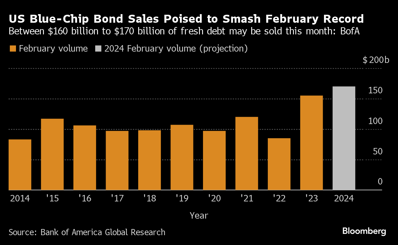 BofA expects companies to sell $160 billion to $170 billion of high-grade bonds this month, the most for any February on record. That would pile atop January's nearly $190 billion deluge of fresh notes, especially as major firms line up for financing after posting their latest earnings.