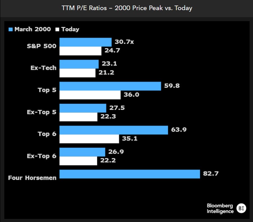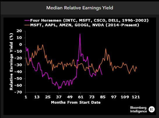 The largest five companies in the S&P 500 trade at less than half the multiples of the “Four Horsemen” — Intel Corp., Cisco Systems Inc., Microsoft and Dell Technologies Inc. — in March 2000, which surpassed 80 times on a forward price-to-earnings basis, according to BI.