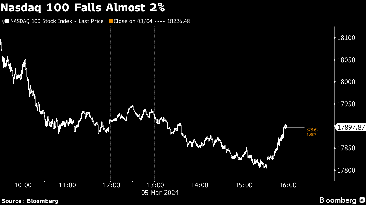 The S&P 500 dropped 1%, while the Nasdaq 100 slipped almost twice as much. Tesla extended a two-day selloff to 11%, while Apple suffered its fifth straight loss. Nvidia Corp. rose. Treasury 10-year yields fell six basis points to 4.15%. Bitcoin slid after a record-setting run that topped $69,000. Gold also hit an all-time high.
