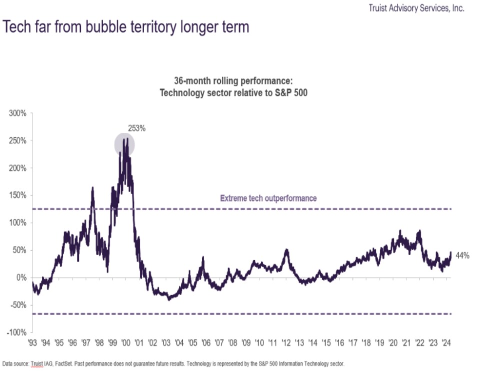 “Although we still have a favorable long-term view of technology, on a shorter-term basis the sector appears extended, and we would not be chasing the sector,” Lerner noted. “That said, the sector appears far from ‘bubble' territory, and we believe secular tailwinds will persist around artificial intelligence.”