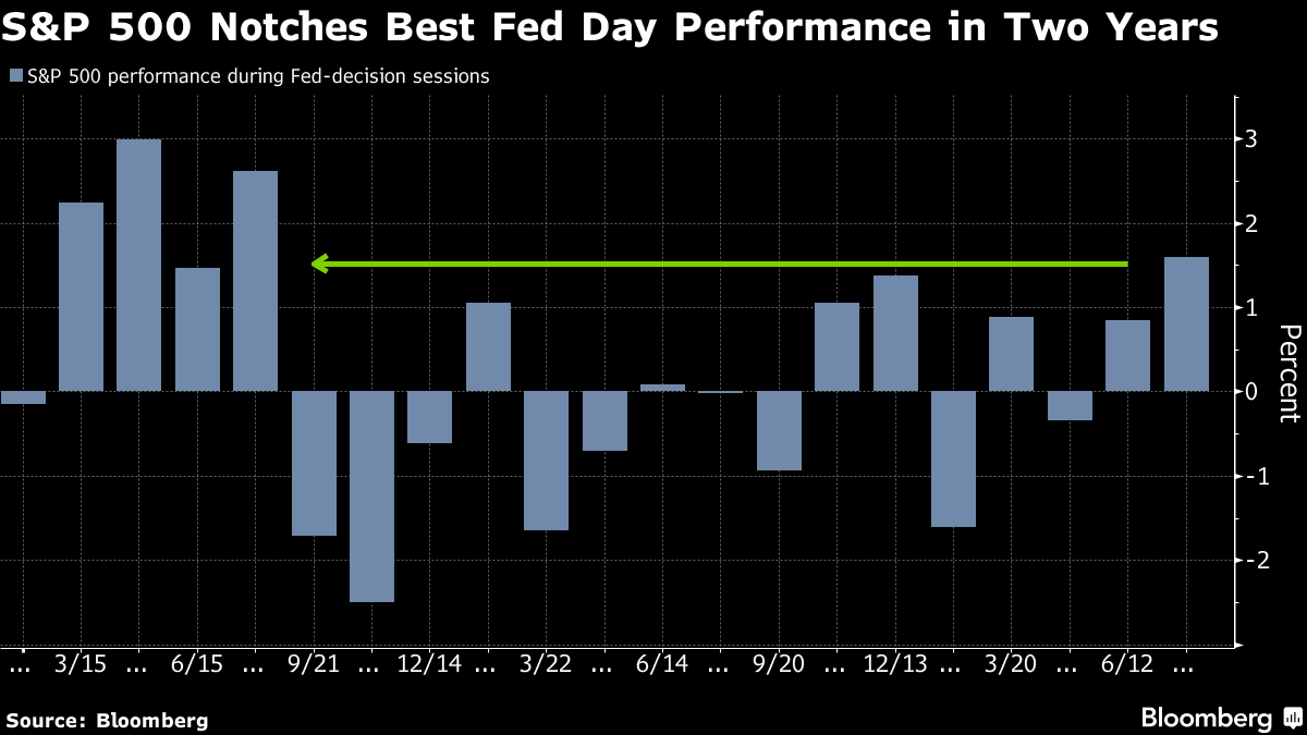 A $563 billion exchange-traded fund tracking the S&P 500 (ticker: SPY) climbed 1.6%. Along with a 1% gain in an ETF of longer-dated Treasuries (ticker: TLT), Wednesday's cross-asset rally was the largest of the year for such sessions when monetary policy was announced. A Bloomberg gauge of the “Magnificent Seven” megacaps jumped 3.5%. The Russell 2000 of small firms added 0.5%.