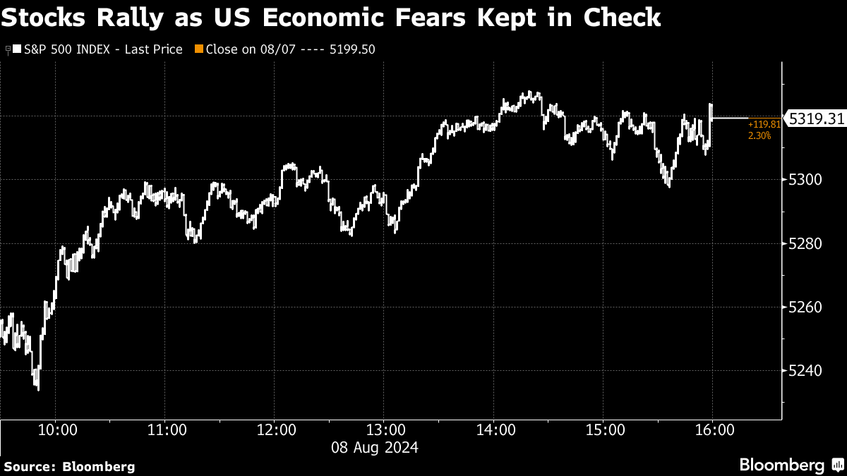 (Bloomberg) -- Stocks staged a solid rebound and bonds retreated after the latest US labor-market reading helped ease concern about a more pronounced slowdown in the world's largest economy.