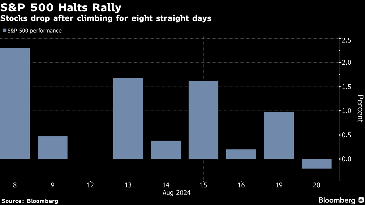 A drop in equities interrupted what would have been the S&P 500's longest winning streak in 20 years. In stark contrast to the “extreme negative momentum” during the panic selling of early August, “euphoria” has taken hold. In only eight days, the US equity benchmark added almost 8%, with positioning returning to extended levels. Just last week, nearly $16 billion in new long bets were added to S&P 500 futures, according to Citigroup Inc.