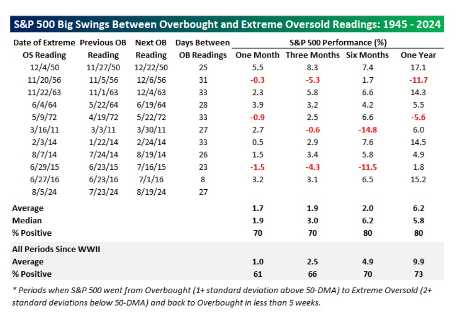 Since World War II, there have only been 10 other periods when the S&P 500 moved from oversold levels down to extreme overbought levels and back to overbought levels in less than five weeks.