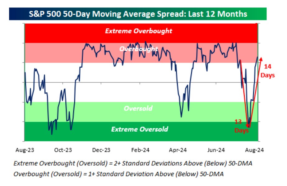 After the S&P 500 last closed at overbought levels on July 23, it quickly sold off and moved into “extreme” oversold territory in just 13 calendar days, according to Bespoke Investment Group. Just as fast as the S&P 500 moved into extreme oversold territory, though, it swung back to overbought levels nearly as fast.