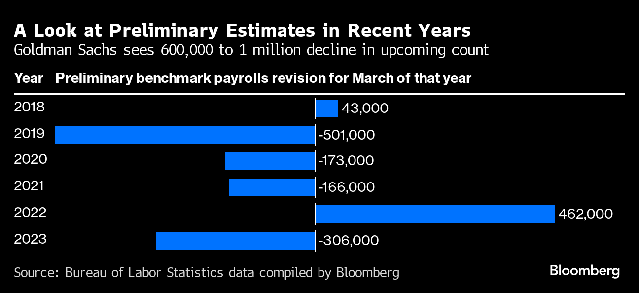 Goldman Sachs Group Inc. and Wells Fargo & Co. economists expect the government's preliminary benchmark revisions on Wednesday to show payrolls growth in the year through March was at least 600,000 weaker than currently estimated. While JPMorgan Chase & Co. forecasters see a decline of about 360,000, Goldman indicates it could be as large as a million.