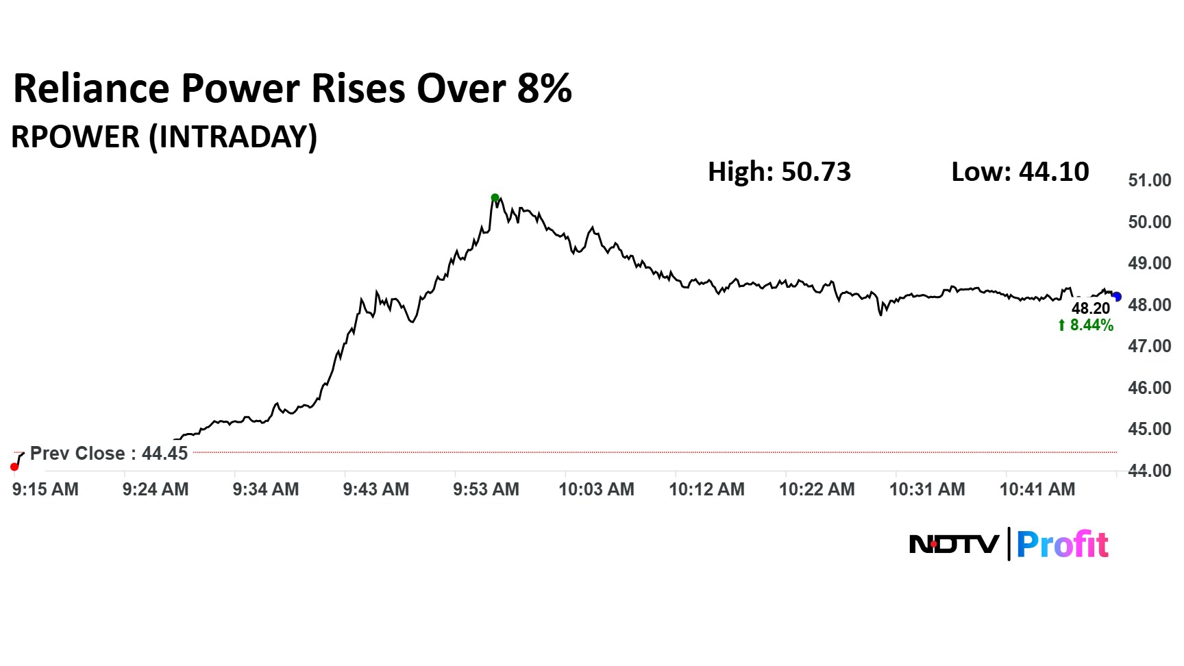 The shares of Reliance Power rose over 8% to Rs 48.2 apiece. These gains compare to 0.45% gains in the Nifty 50 as of 11:12 a.m.