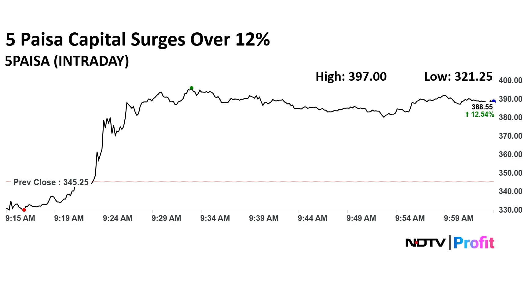 On the back of second quarter results, the shares of 5 Paisa Capital were up over 12%. The scrip was trading at Rs 388.5 apiece and these gains compared to a 0.37% gain in the Nifty as of 10:05 a.m.