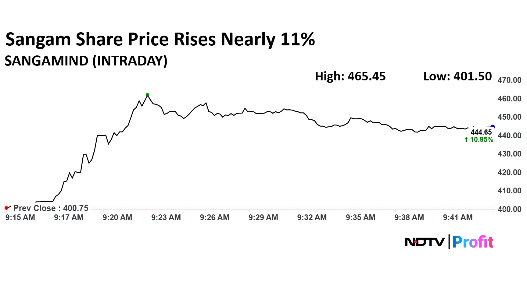 The shares of Sangam was buzzing in trade today after the scrip rose nearly 11% in trade so far. The stock was trading at 444.6 apiece on the NSE.