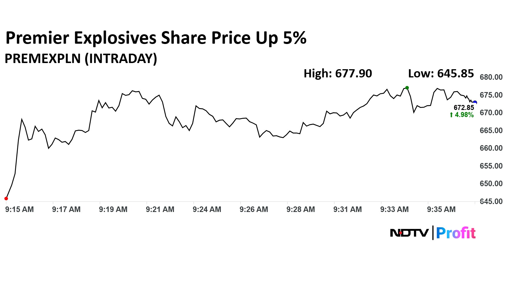The shares of Premier explosives were trading 5% higher at Rs 672.8 apiece on the NSE as of 9:44 a.m. This compares to the 0.36% gains that the Nifty 50 was trading with.