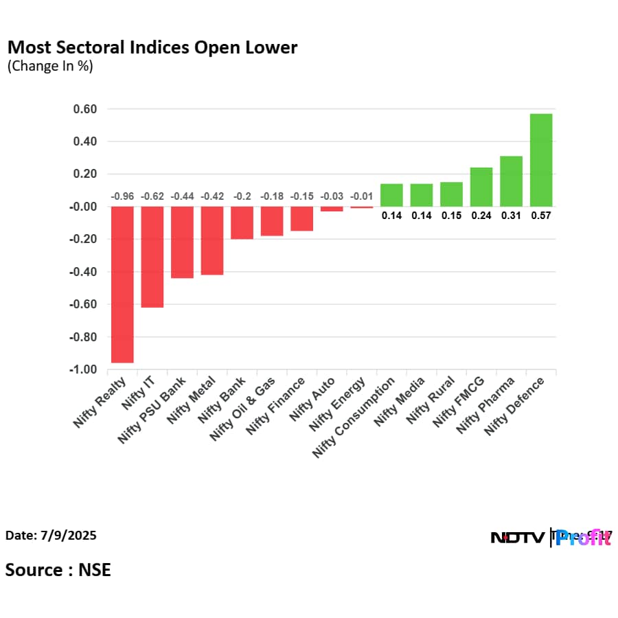 On National Stock Exchange, seven sectoral indices declined, six advanced, and two remained flat out of 15. The NSE Nifty Realty declined the most, and the NSE Nifty Defence advanced the most.