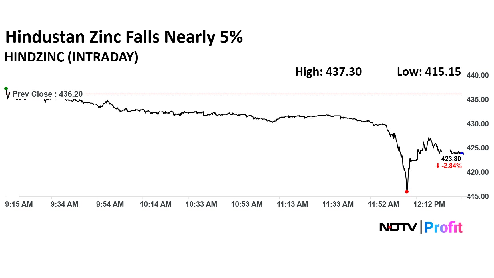 Hindustan Zinc Ltd. share price tumbled 4.83% to Rs. 415.15 apiece. The share price was trading 2.64% down at Rs 424.85 apiece.