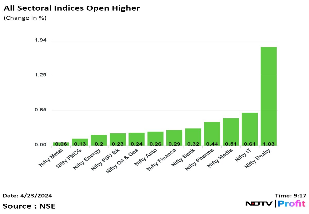 At 1 p.m., the NSE Nifty 50 was trading 68.85 points or 0.3% higher at 22,405.25, and the S&P BSE Sensex gained 221.36 points or 0.3% to trade at 73,869.98.