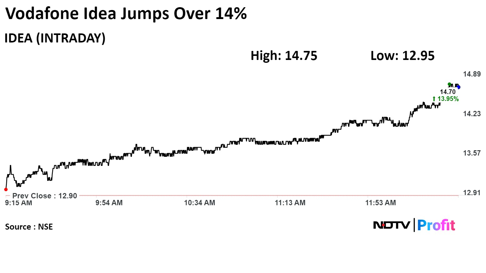 Shares of Vodafone Idea Ltd. jumped more than 14% on Tuesday to the highest in over a month as its board approved the issue price for its Rs 18,000-crore follow-on public offer.