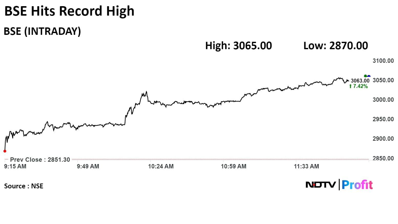BSE Ltd. rose as much as 7.35% to Rs 3,060.90 apiece, the highest level since its listing on Feb 3, 2017. It was trading 7.13% higher at Rs 3,054.70 apiece, as of 12:09 p.m. This compares to a 0.34% advance in the NSE Nifty 50 Index.