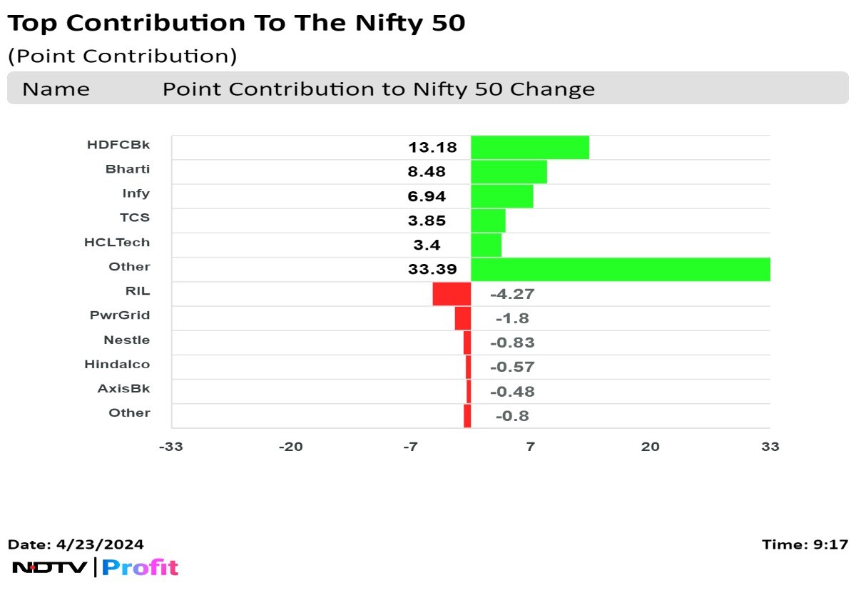 Bharti Airtel Ltd., ITC Ltd., HCL Technologies Ltd., Grasim Industries Ltd., and State Bank India supported the benchmark index.