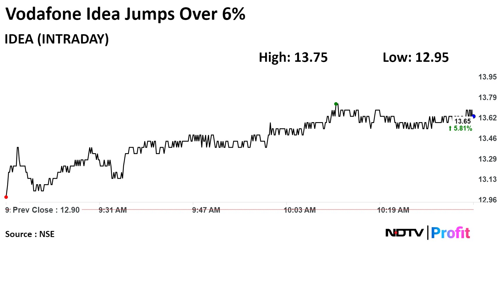 On the NSE, Vi's stock rose as much as 14.34% during the day to Rs 14.75 apiece, the highest since March 5. It was trading 13.57% higher at Rs 14.65 apiece, compared to a 0.34% advance in the benchmark Nifty 50 at 12:32 p.m.
