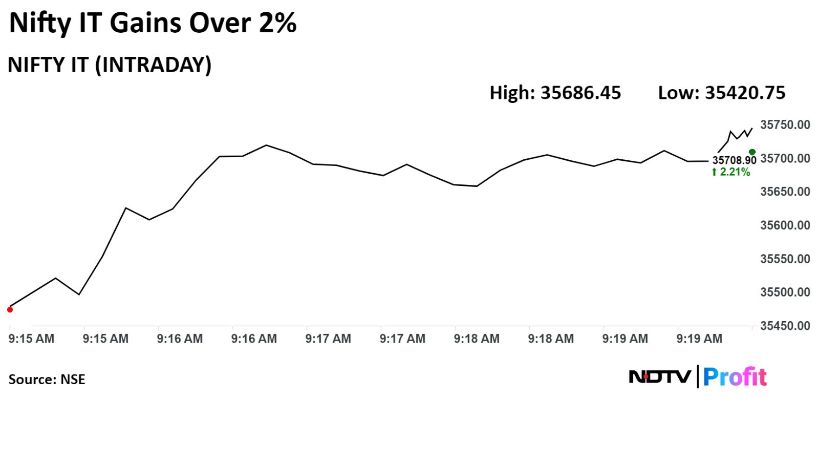 The NSE Nifty IT rose as much as 2.69% to 35,686.45, marking the highest level in three months. The index was trading 72.80 points or 0.31% higher at 23,639.80 as of 09:38 a.m.