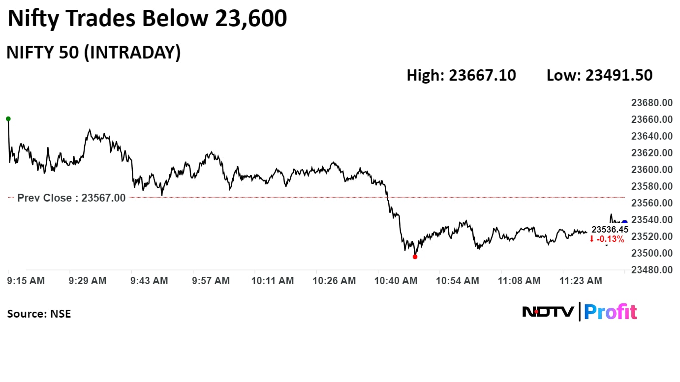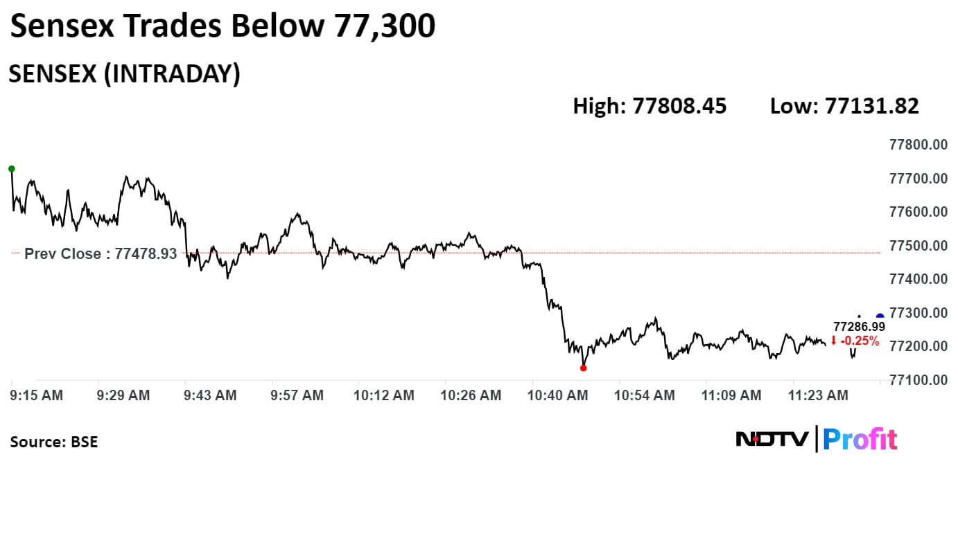 At 11:39 a.m., the NSE Nifty 50 was trading 19.00 points, or 0.1%, lower at 23,548.00, and the S&P BSE Sensex was trading 161.87 points, or 0.21%, down at 77,317.06.