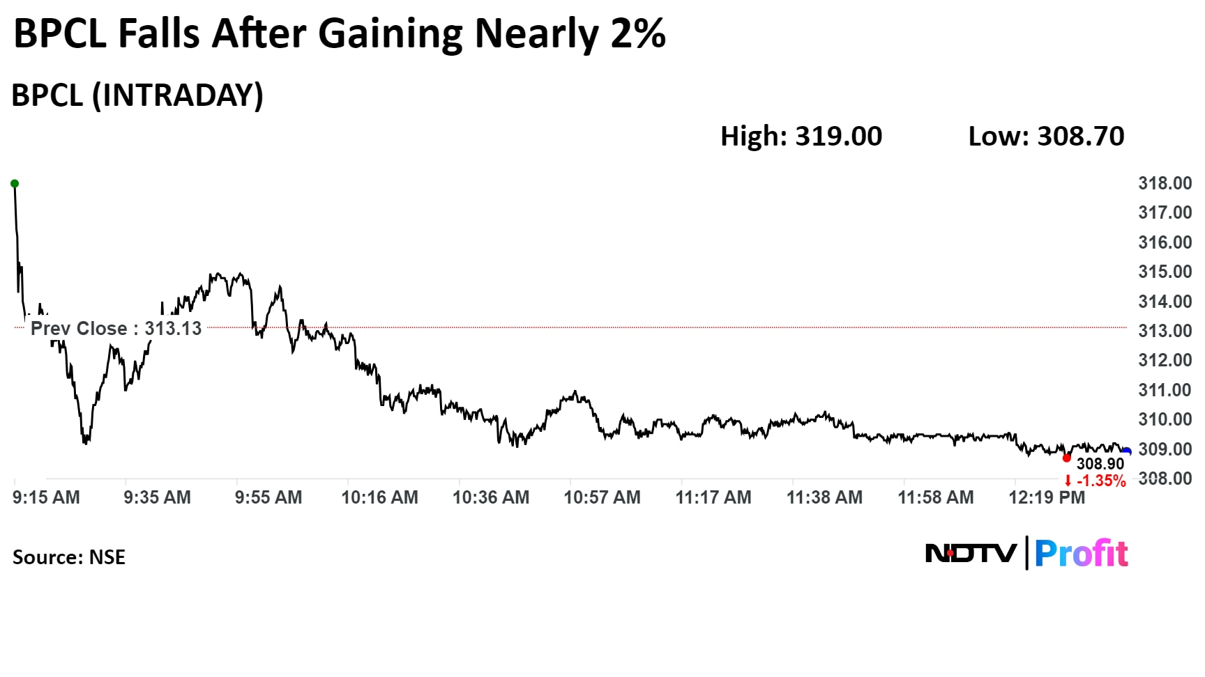 Shares of BPCL rose as much as 1.88% to Rs 319 apiece, the highest level since May 29. It erased gains to trade 1.32% lower at Rs 309.00 apiece as of 12:34 p.m. This compares to a 0.20% decline in the NSE Nifty 50 Index.
