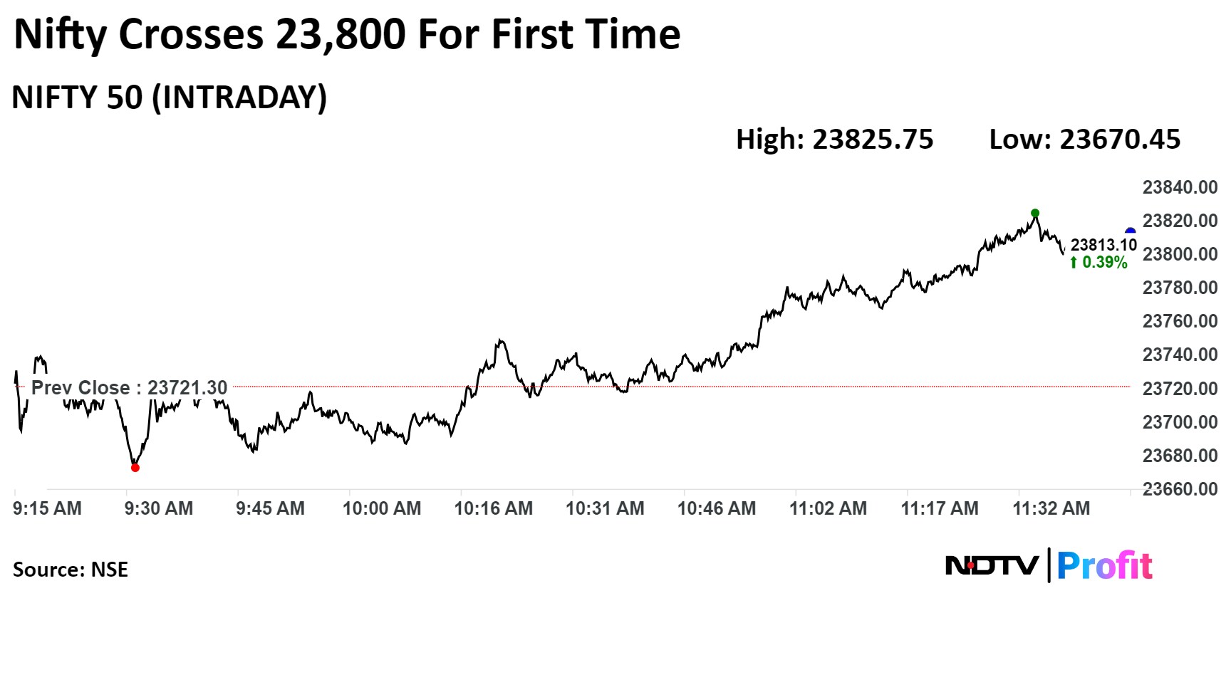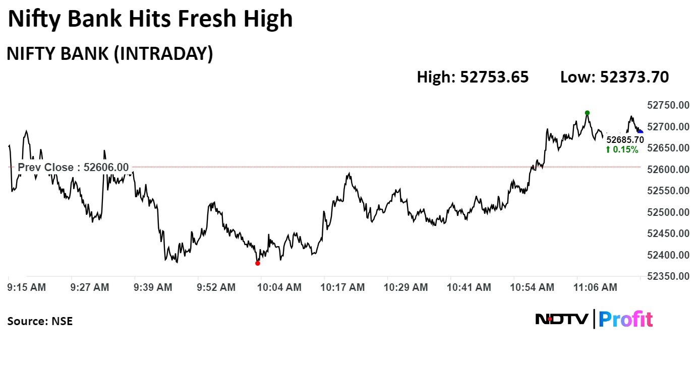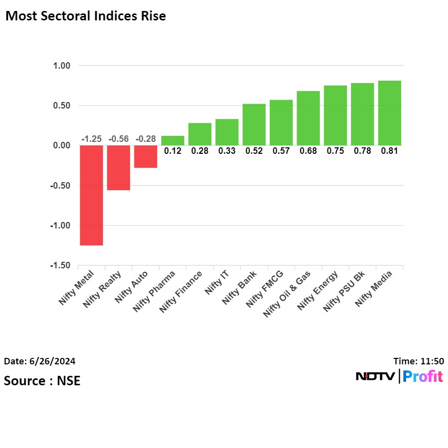 As of 11:51 a.m., Nifty was trading 92.95 points, or 0.39%, higher at 23,814.25, and Sensex gained 397.13 points, or 0.51%, to trade at 78,450.66. Intraday, the Nifty and Sensex hit new record highs of 23,825.75 and 78,483.55, respectively.