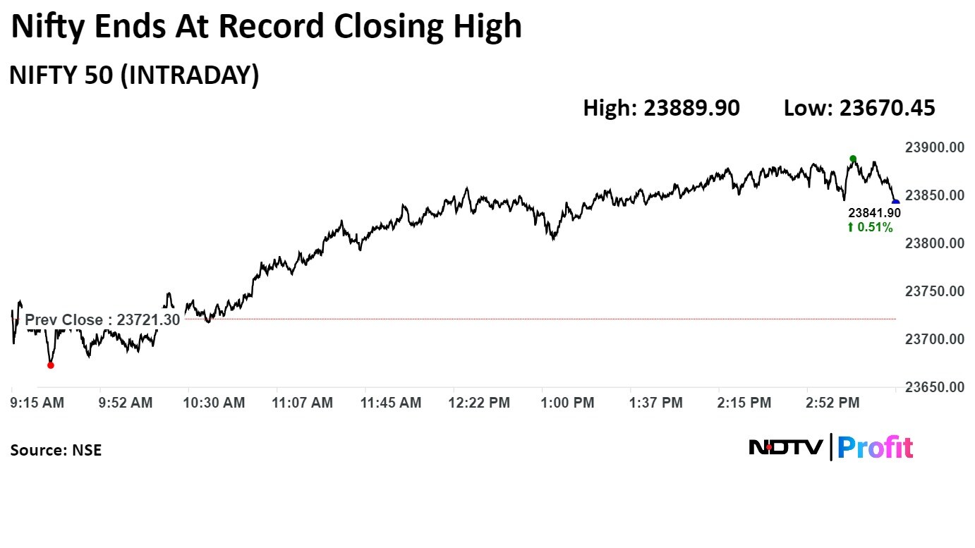 The Nifty closed higher by 0.62% or 147.50 points higher at 23,868.80 points after hitting an intraday high of 23,889.90 and the Sensex rose to its record high of 78,759.40 points intraday and closed 0.8% or 620.73 points higher at 78,674.25.