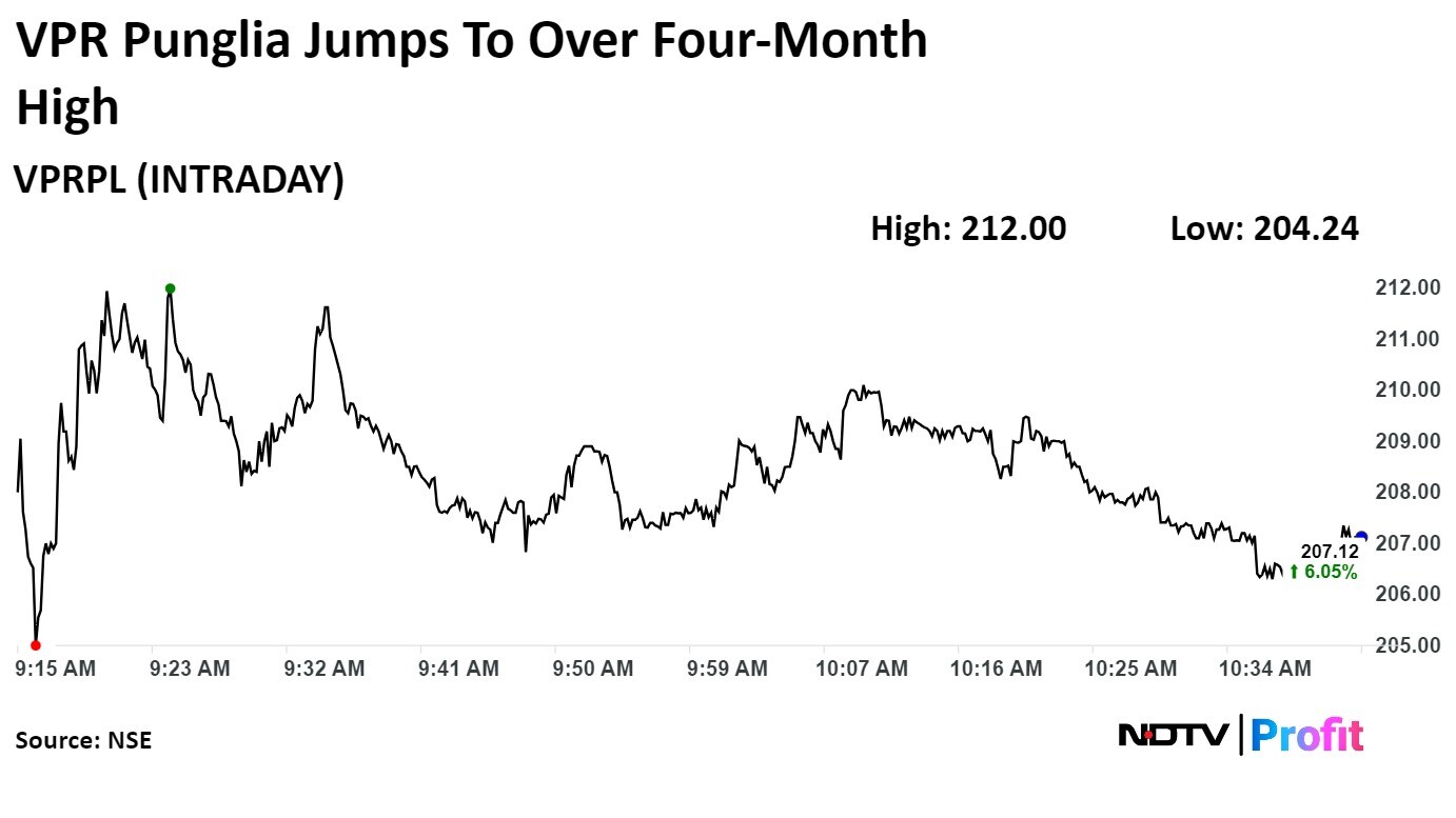Shares of Vishnu Prakash R Punglia Ltd. rose 8.55% to Rs 212.00, the highest level since Feb 9. It was trading 5.73% higher at Rs 206.50 as of 10:50 a.m., as compared to 0.07% advance in the NSE Nifty 50 index.