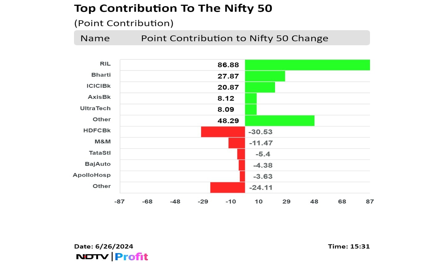 Shares of Reliance Industries Ltd., Bharti Airtel Ltd., ICICI Bank Ltd., Axis Bank Ltd., and UltraTech Cement Ltd. contributed the most to the gains.