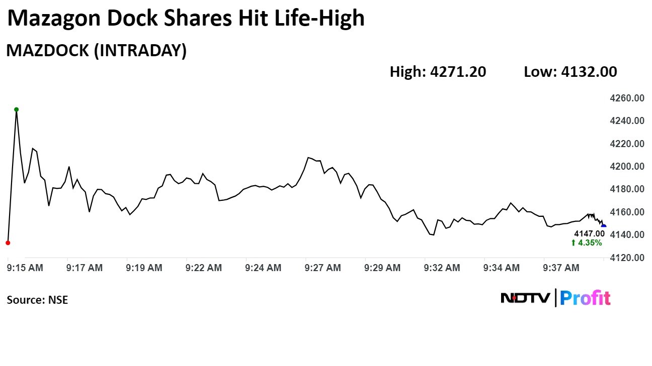 Mazagon Dock Shipbuilders Shipbuilders Ltd. hit its life high on Wednesday after the news of it being granted the status of Navratna. The company notified via exchanges that Department of Public Enterprises approved its proposal on Tuesday.