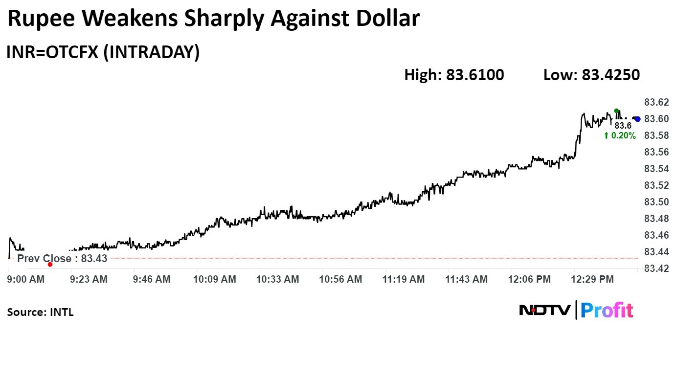 The local currency weakened 18 paise against the US Dollar to 83.61.