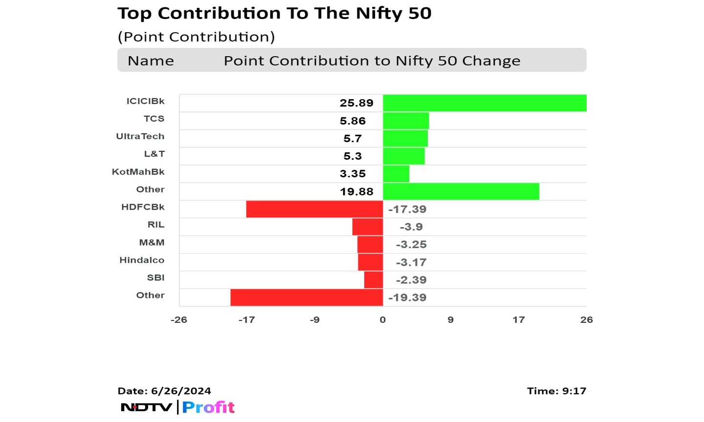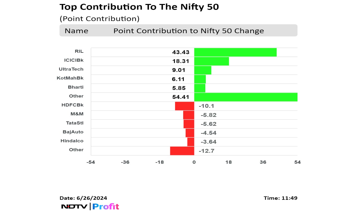 Shares of Reliance Industries Ltd., ICICI Bank Ltd., UltraTech Cement Ltd., Kotak Mahindra Bank Ltd., and Bharti Airtel Ltd. contributed to gains in the Nifty.