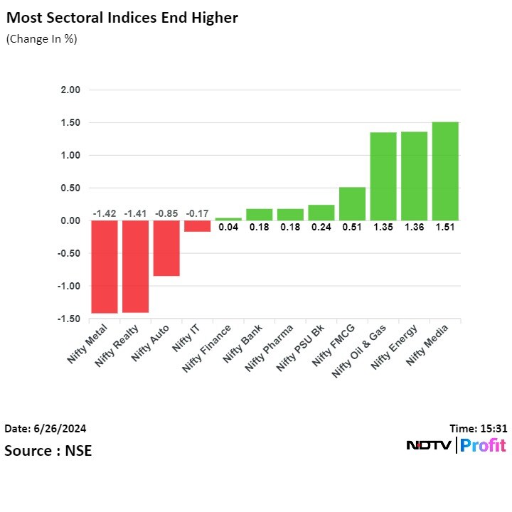 Most sectoral indices ended higher with Nifty Media and Nifty Energy leading the gains.