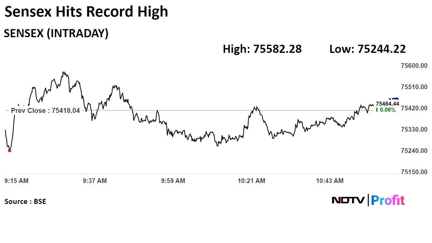 The S&P BSE Sensex rose 0.21% or 164.24 points to a record high of 75,582.28 earlier in the day. As of 12:11 p.m., the S&P BSE Sensex was 9.55 points or 0.01% higher at 75,427.59.