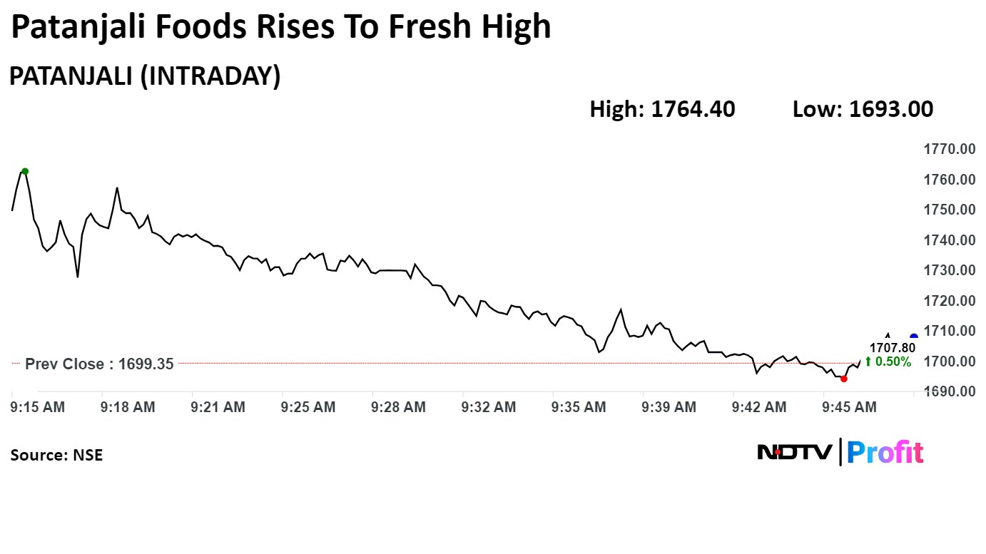 Shares of Patanjali Foods rose 3.83% to Rs 1,764.40, the highest level since it was listed on Jan 24, 2020. It was trading 1.11% higher at Rs 1,718.60 apiece as of 10:12 a.m., compared with a 0.02% decline in the benchmark BSE Sensex.