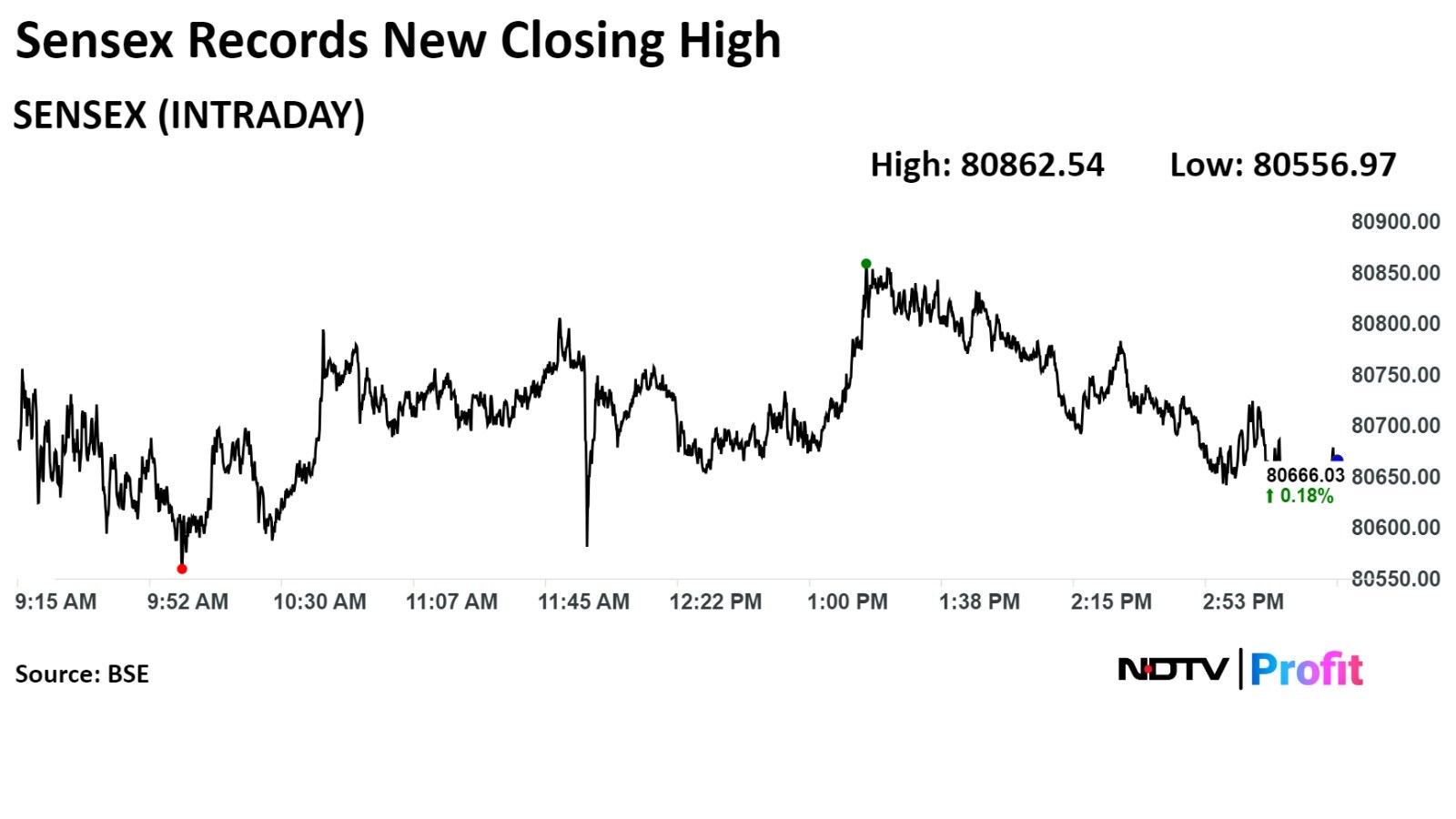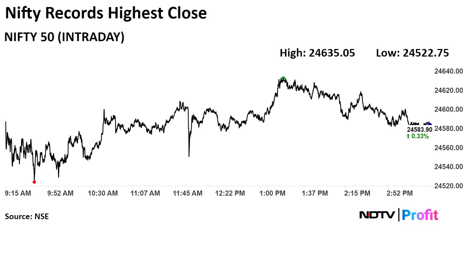 The NSE Nifty 50 settled 81.75 points, or 0.33%, higher at 24,583.90, and the S&P BSE Sensex gained 145.52 points, or 0.18%, to close at 80,664.86. The Nifty hit a fresh record high of 24,635.05, and the Sensex touched a fresh high of 80,862.54.