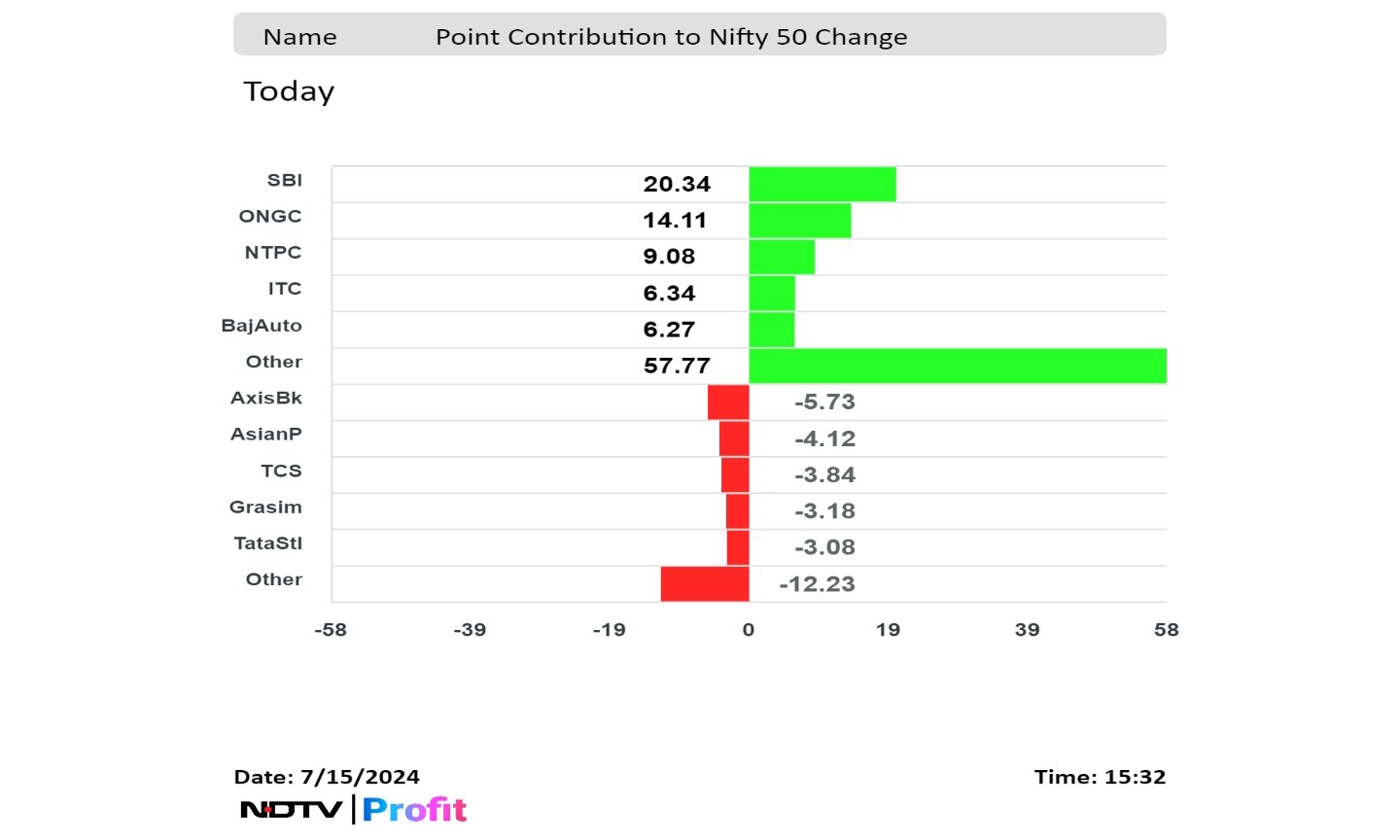 State Bank of India, Oil and Natural Gas Corp., NTPC, ITC Ltd., and Bajaj Auto Ltd. contributed to the Nifty 50.