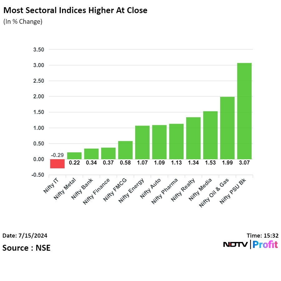 On the NSE, 11 sectors ended higher and one declined. The NSE Nifty IT declined, and the NSE Nifty PSU Bank rose the most.